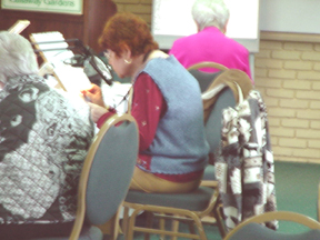 Callaway Gardens 2001 Needlearts Seminar For over 20 years Carol has gone to 'camp' at various needlearts places and Jerry could never play 'spouse'! Plans for both to attend the 2000 seminar at Callaway Gardens were placed on hold due to a hospital stay for Carol. As we approached the 2001 seminar time it came to the mind of the 'good old doctors' that working on a needlearts project at Callaway was a great rehab for Carol. Thus the trip came to fruition. Following are some shots of the group at work and play. |